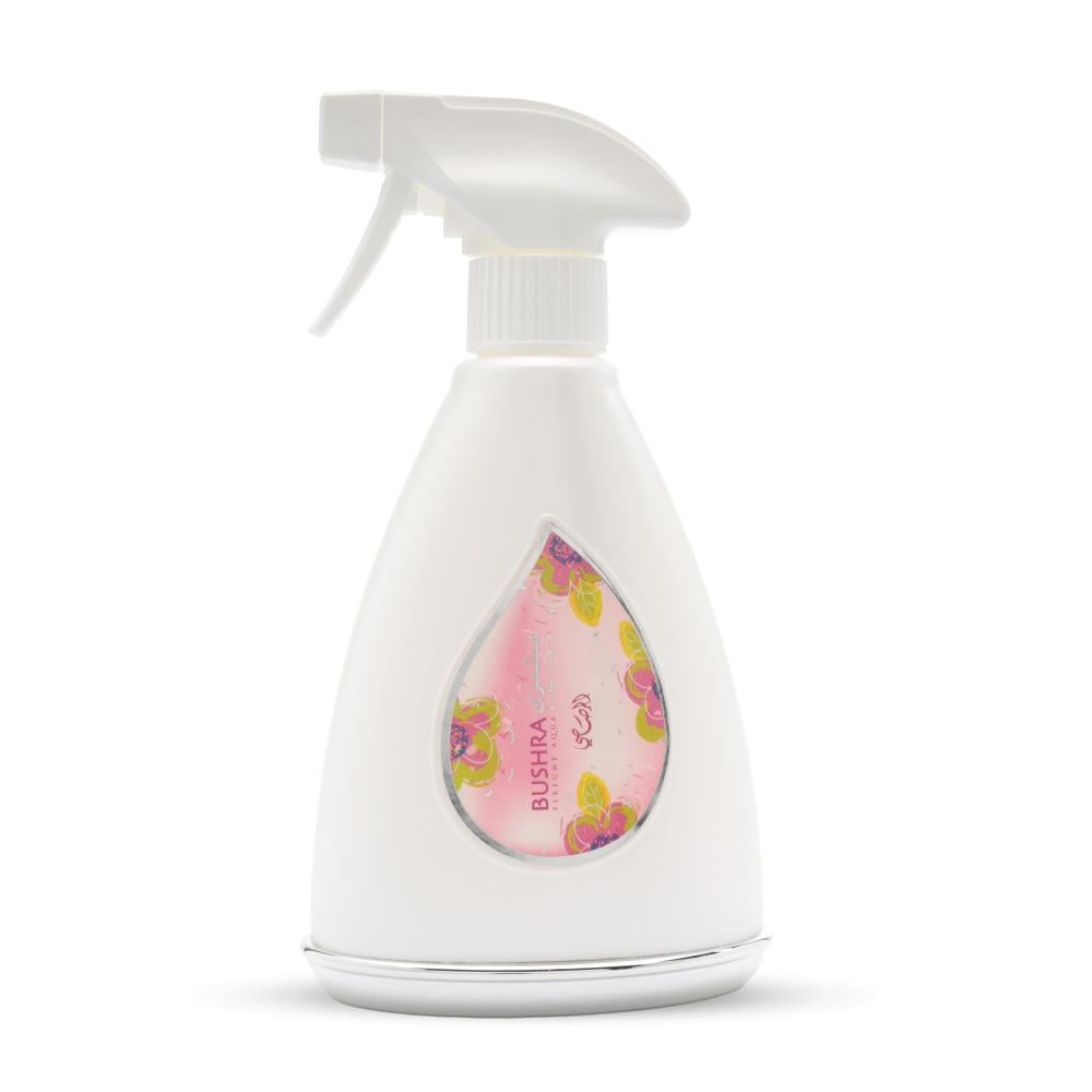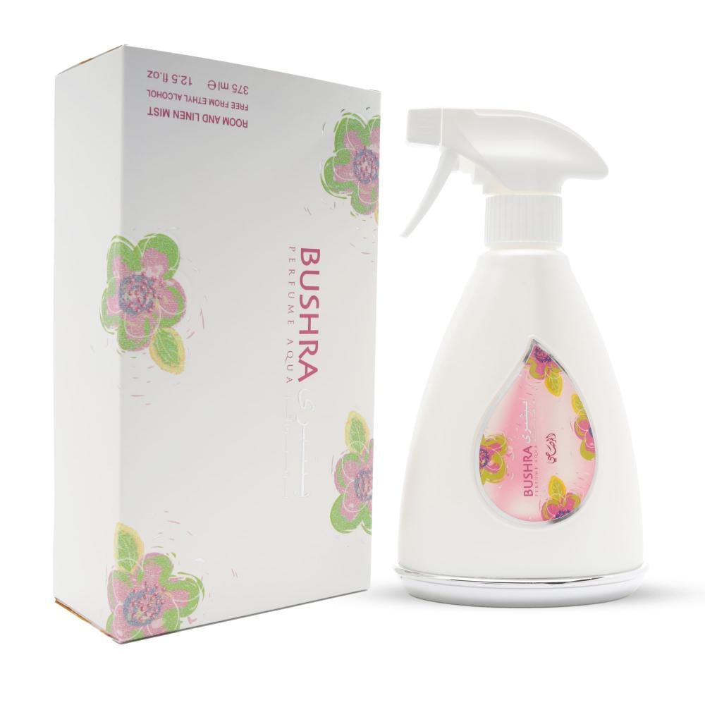 Perfume Aqua Bushra is a premium water-based fragrance formulated with a secret blend of essential oils and anti-bacterial ingredients. Developed to effectively overcome unpleasant odors and add a fragrant touch to your ambience. Perfume Aqua can be used on curtains, carpets, bed linen, clothes while ironing, and on your hands after meals. All the ingredients used in Perfume Aqua are friendly to human skin, and therefore can be safely used on your body, particularly after you shower